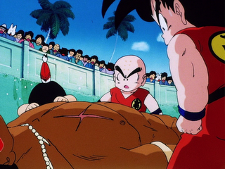 Later, Krillin competes with Goku and Yamcha in Fortuneteller Baba's tournament for Goku to get the location of a Dragon Ball in order to revive Upa's fallen father. He offers to fight first, and is met by Fangs the Vampire, who starts to dance on the arena, greatly annoying Krillin. Krillin eventually loses the battle by getting the blood sucked out of his head, causing him to lose consciousness and get kicked out of the area. However, Krillin cunningly comes up with the strategy that allows them to later defeat See-Through the Invisible Man. The side of Krillin that uses his wits, rather than his strength, to his advantage is seen many times in both series, particularly as he becomes comparatively less powerful.