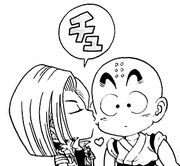 Like his mentor Master Roshi, Krillin is known to be perverted even bribing Master Roshi with a Dirty magazine when he was first introduced at the age of 12. He was also already considered "impure" of heart due to his perverted tendencies and was unable to ride the Flying Nimbus without clinging to Goku. He also came up with an elaborate and unnecessarily perverted plan during the Fortuneteller Baba Saga to expose Bulma's breasts to Master Roshi in order to have Master Roshi produce a massive nosebleed to cover See-Through the Invisible Man in order to aid Yamcha in defeating him. However he is shown to have become less perverted as an adult and is more interested in genuine romance as he notes his desire to get married several times in Dragon Ball Z. In the anime filler he even contemplates marrying Maron though ultimately decides to break up with her only to reconsider when she reveals she would have said yes, but she ran off with some guy who promised her ice cream. In Super Android 13!, he waits in line for a beauty pageant with Roshi, Oolong, and Future Trunks though he admonishes Oolong and Roshi as setting a bad example for a young man like Trunks, though Master Roshi points out Krillin might be able to find himself a wife which causes him to get excited by the idea. Before meeting Android 18, Krillin began to wonder if he would ever find love, at one point in Super Android 13! even lamenting he would probably die alone. He is also taken with Zangya's beauty when he mistakes her for the opponent he is supposed to fight in Bojack Unbound. While Krillin loves his wife, he has been shown to retain some of his perversion as while saving Nain in Bio-Broly she hugs onto him tightly causing him to blush, though this ends up causing his wife to angrily push both of them. Additionally in Xenoverse 2, he notes that the Launch Costume is a pretty daring look and that while he never really looked at her clothes back in his youth, they do show a lot of skin and wishes he had watched more closely when he had the chance, before nervously stating he is totally committed to Android 18. In Dragon Ball FighterZ, he agrees with Yamcha's opinion that Android 21 is cute, though this causes Yamcha to think that Krillin has a thing for female Androids which Krillin denies, though unfortunately their conversation is overheard by Android 18 who glares at them both, terrifying them to the point they are unable to turn around.