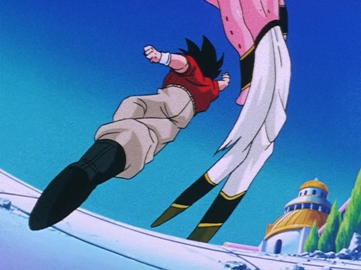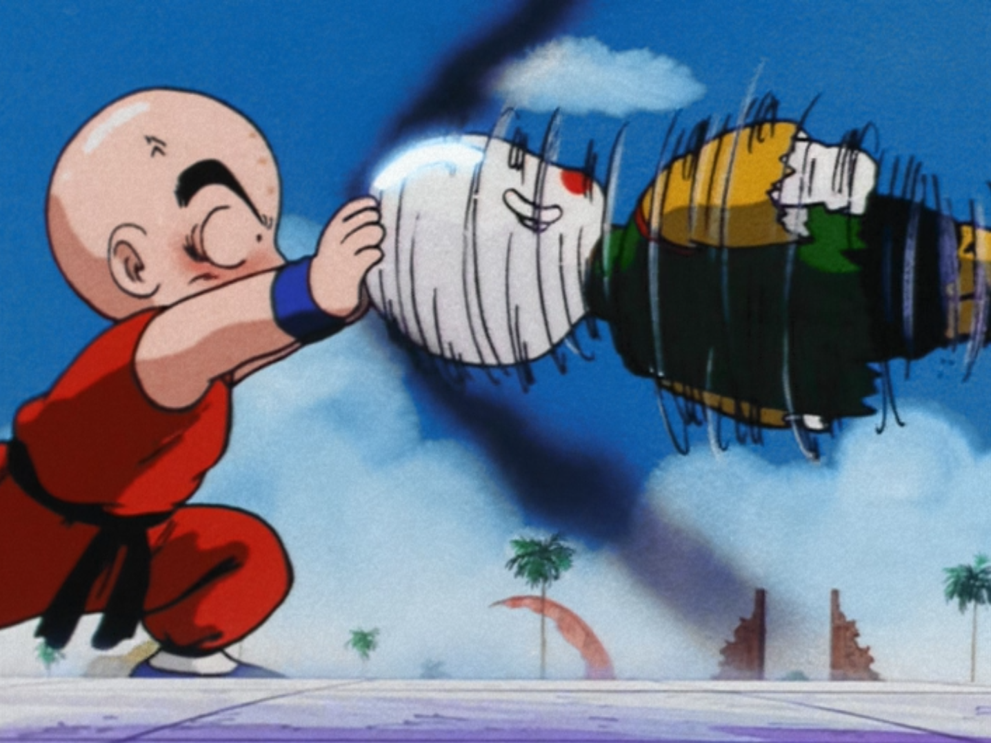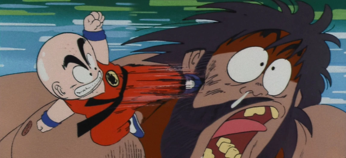 Krillin gives Bacterian a full-power kick to the jaw