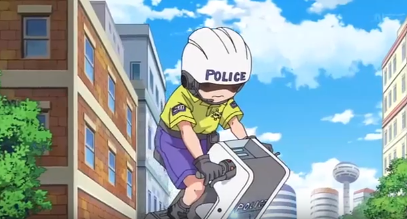 By the time of Dragon Ball Z: Resurrection ‘F’, Krillin has taken up the job of a police officer, he wears a uniform with a yellow polo shirt and purple formal shorts, a badge, and a helmet. When getting prepared to battle Frieza, Krillin asks Android 18 to shave his head for "old times sake". When he is off-duty, Krillin wears a red short sleeved shirt with a sign "Taco" at the center, jeans and blue sneakers. In preparation for the Tournament of Power, Krillin once again wears his orange turtle school gi, minus the weighted clothing he previously wore during the Android Saga through the Cell Games Saga, although his gi has become visibly faded with time, leaving it a more pale orange compared to Goku and Gohan's versions of the outfit.