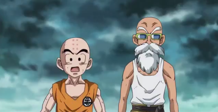 During Dragon Ball Z: Battle of Gods and the earlier episodes of Dragon Ball Super, Krillin wears his black hair in a short, fairly spikey style and dons a green changshan (Chinese men's coat) with a Turtle School crest on the left breast as a mark of respect for Master Roshi, in addition to dark blue-gray pants and charcoal-gray kung fu shoes. Strangely, in the manga, his head remains shaven.