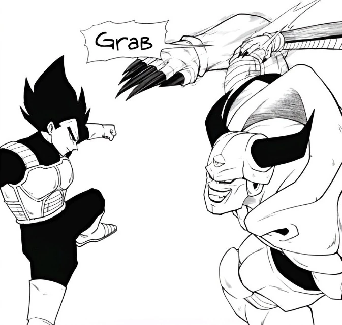 Additionally, Ozotto gets the opportunity to test out Piccolo's regeneration after Xeno Trunks slices his left arm off. He notes that though the ability is convenient, he can't afford to use it repeatedly, but changes interest to Xeno Trunks' transformation and attempts to absorb him, too. Using Hearts' mind-reading ability, he is alerted to an attack from behind by Super Saiyan Blue Vegeta, whom he blocks effortlessly. Vegeta recognizes Hearts' technique and realizes the depths of Majin Ozotto's plagiarist fighting style, calling him out. Ozotto does not seem to care and only confirms his suspicions before morphing his left arm to try and absorb Vegeta.