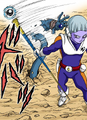 With a simple gesture, Moro dispels the barrier and, knowing that he must buy some time for Goku and his comrades, Merus charges into action using a pole. Moro notes that he cannot sense Merus's life energy like he could before and asks if he is some manner of deity. Choosing not to answer, Merus continues to attack with his pole, displaying an impressive level of agility and reflexes that puts Moro on the defensive.