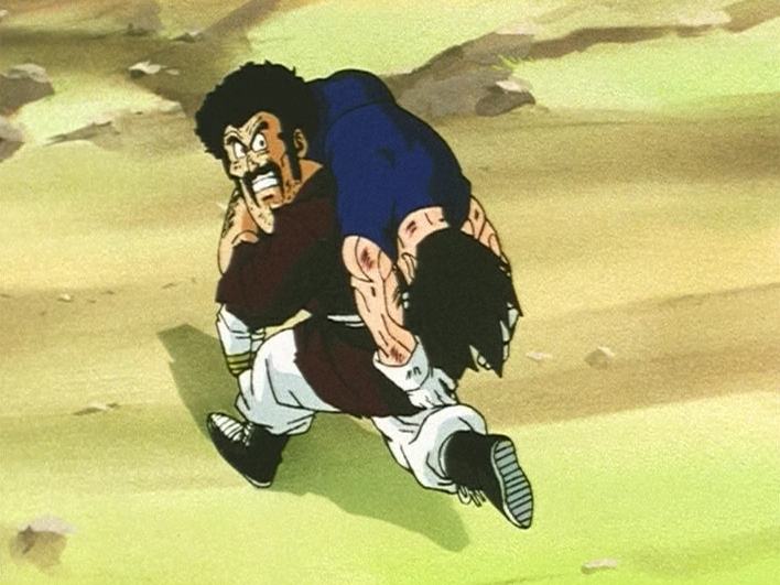 Mr. Satan carries Vegeta out of the Spirit Bomb's range, so Goku can throw it
