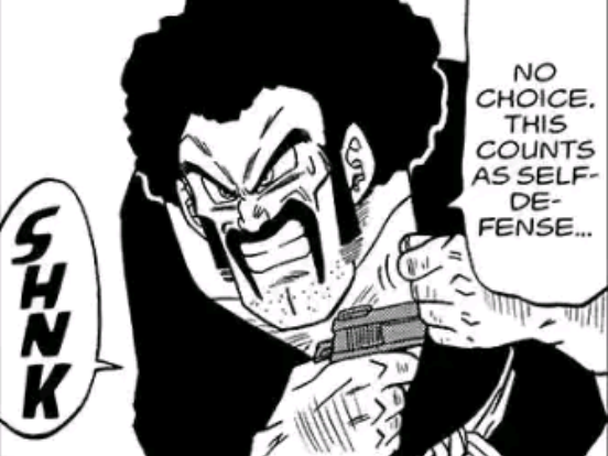 During the battle against Super Buu, Mr. Satan is angered to the point that he screams "I hereby terminate our friendship, Majin Buu!" and gets out a 45-Caliber gun. In one hilarious moment, when Super Buu fires a Finger Beam to kill Dende, Mr. Satan shoots at it and it explodes, when in reality Tien intervened and countered it with his Tri-Beam technique. When Super Buu prepares another one (and a much more powerful one, one which Tien had no method of nullifying), Mr. Satan once again starts shooting at Super Buu, and Super Buu is sliced in half, when in reality Goku returned and fired a Destructo Disk at him.