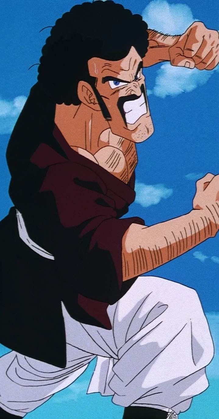 In the end of Dragon Ball Z and throughout Dragon Ball GT, his black curly afro is now in half as the center of his head is naturally bald and a few wrinkles due to his age. In his later years, his mustache now connects to his sideburns.