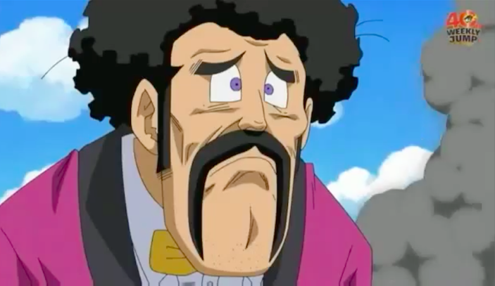 Mr. Satan watching the battle between Super Vegito and Buu