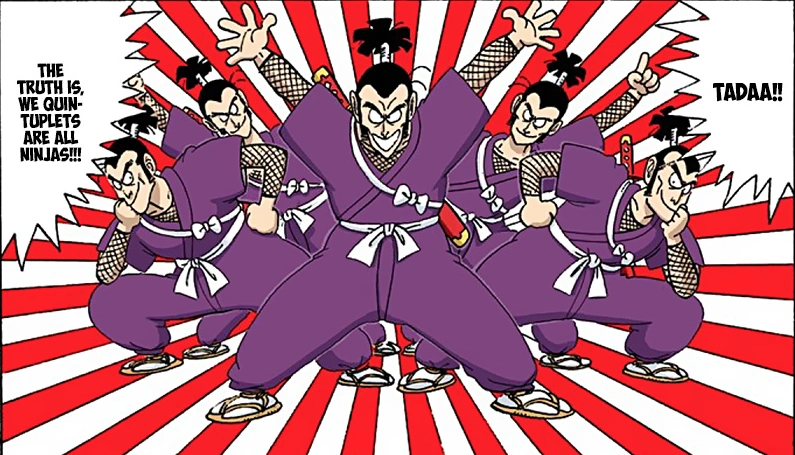 - Copy Technique ( Bunshin no Jutsu)- The ability to seemingly create clones of oneself by ninjutsu. In reality, Ninja Murasaki simply summons his brothers who wear identical clothing and replicas of Sasanshiki to create the illusion that they are Ninja Murasaki's clones.