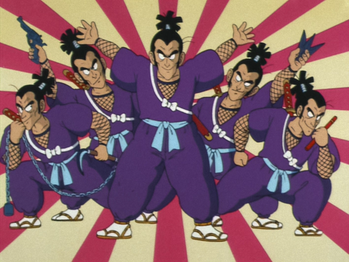 The four were supposedly "clones" of the original Murasaki but, in reality, they are his identical brothers. They each wield a different weapon. They distract Goku while Murasaki escapes. Goku manages to defeat all of them with punches, kicks, and the last one with a Power Pole whack to the head. They are killed when Android 8 destroys Muscle Tower, which collapses on them, though Murasaki himself survives in the anime.