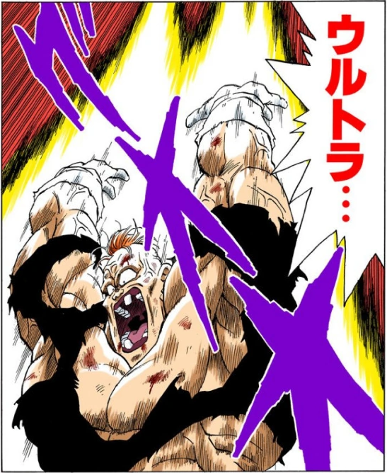 Goku elbowing Recoome in the stomach before he can complete the Recoome Ultra Fighting Bomber