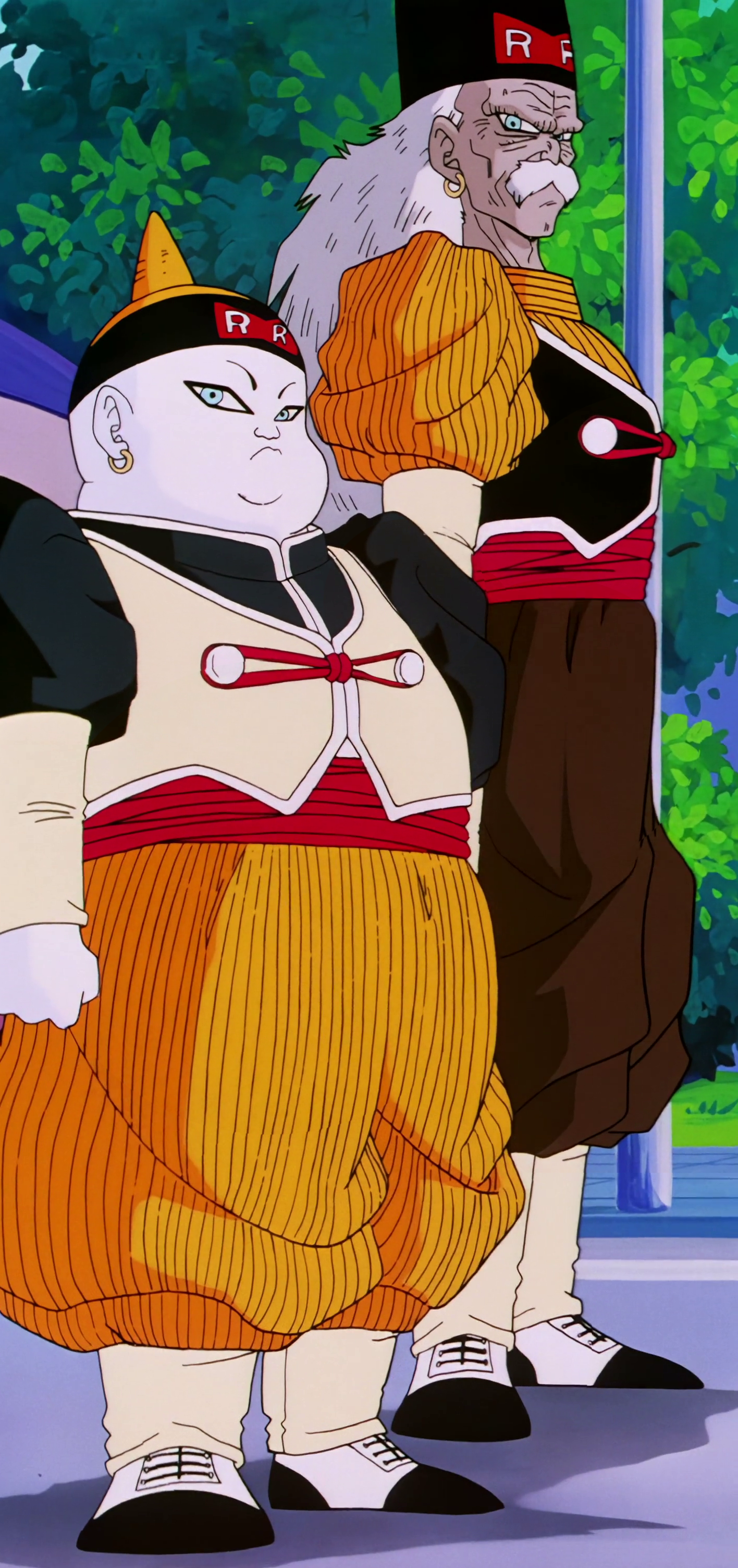 Dr. Gero built Androids because mechs can be captured and used by the enemy while Androids can think for themselves. 1-7 and 9-12 were completely artificial, but Gero could not control their personalities: too dark, too stupid, too nice, etc.[2] So he destroyed them. Dr. Gero's process of turning a human into an android completely halts their aging, thus making the cyborg immune to at least natural death/illness.[3][4] Gero eventually decided to turn himself into Android 20 in order to become immortal.[3][5] Red Ribbon Androids 13 through to 21 all wear loop earrings. In the anime, Android 19 often flicks one of his earrings before attacking. Android 13 and Android 17 also do this once, against Piccolo. Super 17 does this while searching for Goku once during their fight in Dragon Ball GT as well.