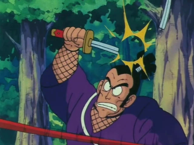 Then they get serious and start fighting for real. Murasaki slashes Goku and Goku slashes back with the Power Pole, causing a crash and they jump away from each other. Goku counterattacks with a few more Power Pole slashes, which Murasaki barely blocks. Ultimately, Goku leaps in the air, slashes again with his Power Pole, and the sword breaks in two.