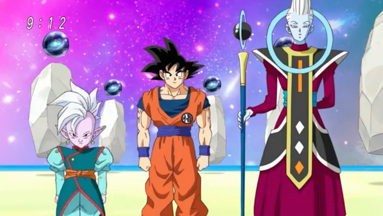 In the anime, when Goku and the others are being pinned down to the ground due to Hearts' Gravity Burst, Shin appears in Universe 11 and urges Goku to quickly use his Instant Transmission to teleport everyone away.
