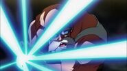 Dium tries to attack Krillin, but Gohan counters the attack, saying there's no need for them to exert too much. Piccolo takes off his weights, and Krillin, despite Beerus telling him to just run, uses Destructo Disc Triple Blade to cut Dium's wings, and he is knocked out of bounds by Master Roshi's MAX Power Kamehameha. Beerus reminds Vegeta that Magetta's weakness is insults, and Vegeta calls him several names, and Champa laughs and says Magetta overcame that weakness. Botamo sits on Magetta's shoulders, calling themselves Bota Magetta with Botamo's invincible body and Magetta's mental strength, but Vegeta points out that Botamo is covering Magetta's ears to counter the insults. Magetta shoots his Lava Spit, and Vegeta dodges and tries to punch Botamo off, but Botamo absorbs the damage.
