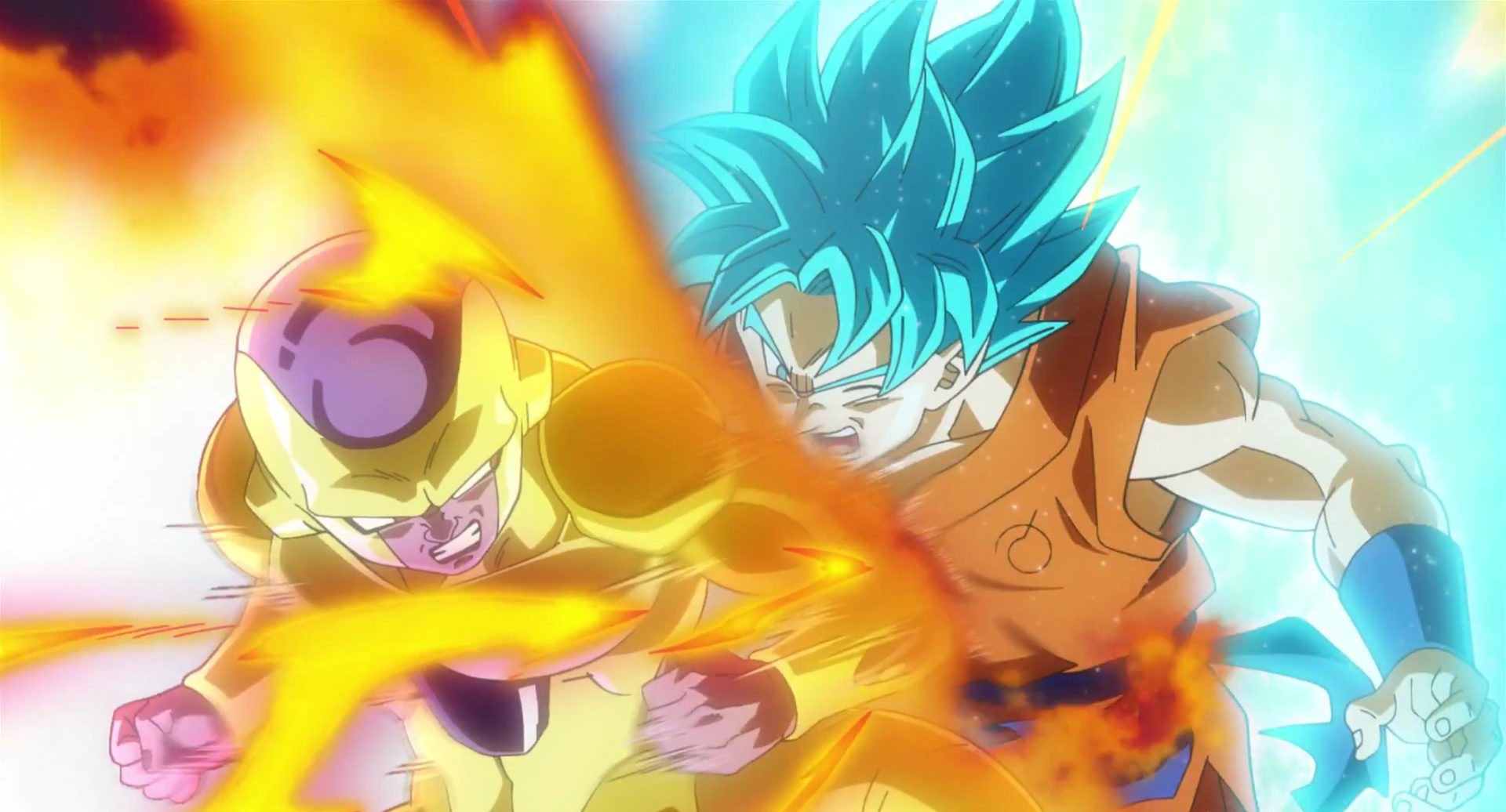 Later, Super Saiyan Blue Goku charged an all-out fist-to-fist clash against True Golden Frieza, once their punches made contact with each other, deeply hitting both their faces, they proved to be exactly on par with each other as both fighters were knocked out simultaneously after they briefly slipped past each other.