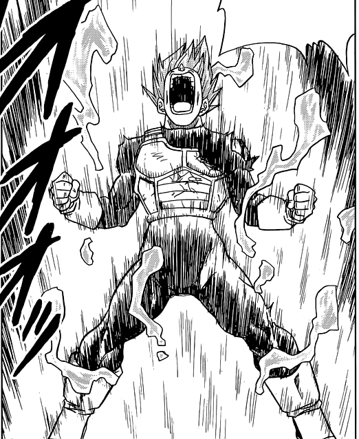 This exists in the manga as well as during the final ordeal with Fused Zamasu, Vegeta greatly powered up in anger after he witnessed Future Trunks and Future Mai apparently dead on the ground. With this power, Vegeta is able to blow both Goku Black and Future Zamasu (who had morphed into Infinite Zamasu) into pieces with Gamma Burst Flash, but to no avail, since the mad Supreme Kai still regenerated after taking all that damage.