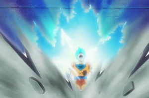 In Dragon Ball Z: Resurrection ‘F’, after Goku achieves the Super Saiyan God form and absorbs its power, and Goku and Vegeta train with Whis and master their ki control, they can use this new transformation. Goku uses this transformation against Golden Frieza in battle. Though he is able to hold his own, he is unable to defeat the tyrant until Frieza loses stamina at which point he gains a significant upperhand, but Sorbet uses his Bad Ring Laser and mortally wounds Goku.
