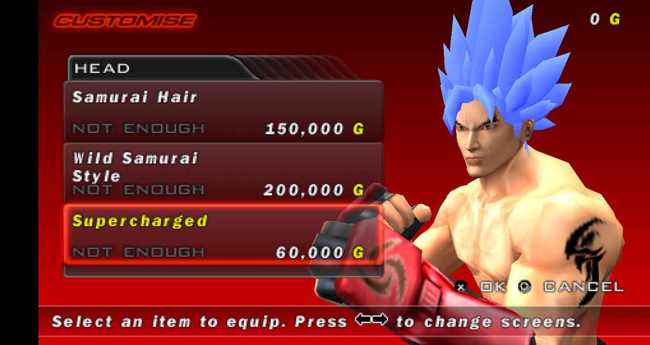 - Coincidently, back in 2005, Tekken 5: Dark Resurrection had an item for a character Jin Kazama, called "Supercharged", which by the time was supposed to resemble normal Super Saiyan hair, but was colored blue instead. The main coincidence is what that accessory had the same hue and shade of blue as the current Super Saiyan Blue.