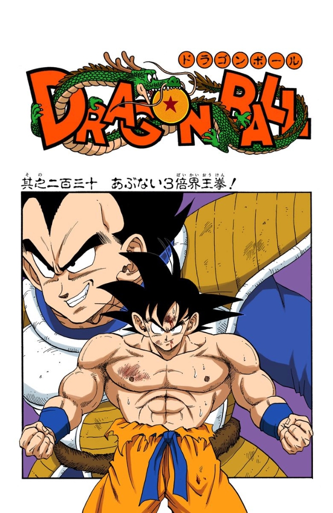 The cover of this chapter shows Goku ready for battle. Vegeta is seen grinning behind him.