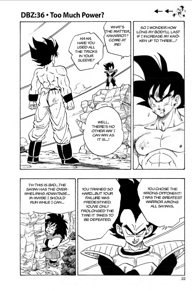 "Too Much Power?" (あぶない3倍界王拳! Abunai San-Bai Kaiōken!, lit. "The Dangerous Three-Fold Kaiō-Ken!") is the thirty sixth chapter of Dragon Ball Z and the two hundred thirtieth overall chapter of the Dragon Ball manga.