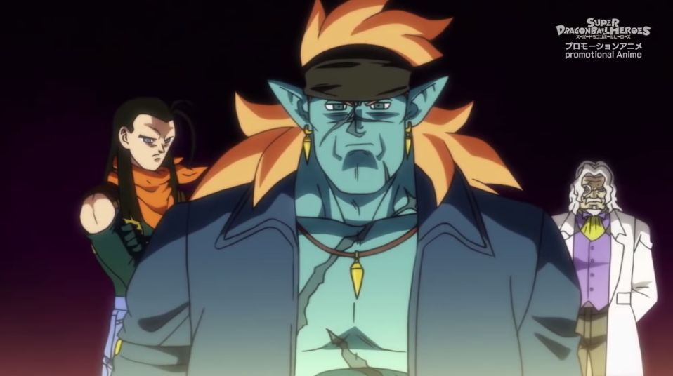 The newly fused Super Full Power Saiyan 4 Limit Breaker Xeno Vegito arrives at Fu's location, and Towa expresses her surprise that he was able to escape the Crack of Time. Fu recognizes their form as the limit-breaking power that Dr. W mentioned and wonders if they have infinite potential, but adds that their potential is etched into his genes and so he's also getting excited. As Xeno Vegito engages Fu in battle, the silhouette of Broly with red eyes appears.