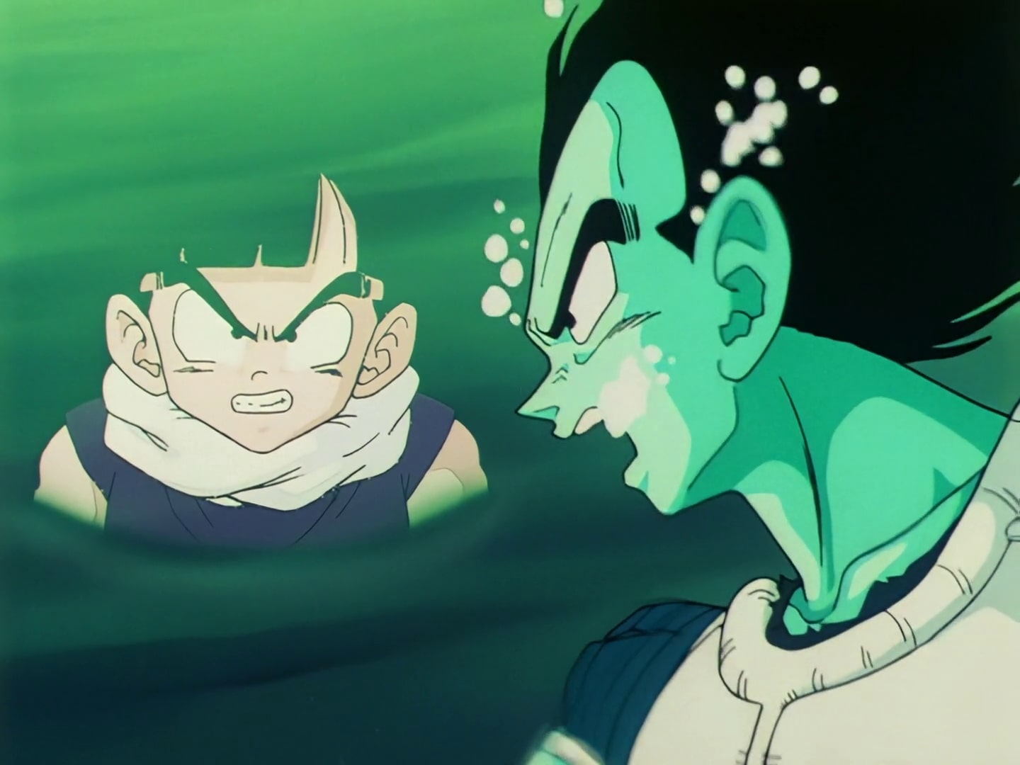 Relieved that Vegeta didn't get a hold of the Dragon Ball, Gohan returns to Krillin and Bulma, who then decide to leave the area before Vegeta comes back looking for them. At the Namekian village, Vegeta dives into the water to find the last Dragon Ball only to find that it isn't there. Realizing that he had been duped and that Gohan didn't actually have a watch but an object that must track the Dragon Balls' location, he loses himself to rage and races back to the cave where the Earthlings had previously been only to find that they were long gone.