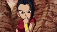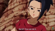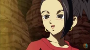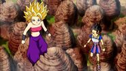 Goku arrives in the after life and asks King Yemma to let him meet with Frieza, much to King Yemma's shock. He asks what business Goku has with Frieza and Goku explains the situation. Although he warns Goku that Frieza will never repent and may cause chaos on Earth, King Yemma is more concerned about the universe being erased and gives Goku permission to go to Hell. In Universe 6, Cabba and Caulifla try to teach Kale how to transform into a Super Saiyan. Kale struggles to transform by focusing on releasing her energy from her back. Caulifla starts insulting Kale to force her to transform through anger, and Cabba is confused. Kale apologizes because she is a weak Saiyan. Caulifla then orders Cabba to insult Kale but he instead makes her cry, and Caulifla berates him for hurting Kale's feelings. Kale, through jealousy of Cabba and Caulifla's friendly arguing, abruptly transforms into a completely different Super Saiyan form. Caulifla is stunned and wonders how she did this, and Cabba thinks it's because Kale thinks Caulifla likes Cabba. Kale attacks Cabba, trying to kill him while Caulifla praises Kale for her newfound power. However, Caulifla realizes Kale's instability and transforms into a Super Saiyan 2 to save Cabba from getting killed by an energy blast. Caulifla tells Kale she doesn't need to get upset because she would never fall for Cabba. Kale turns back her normal state and collapses into Caulifla's arms. Cabba tells Caulifla that she has accidentally found a team member.